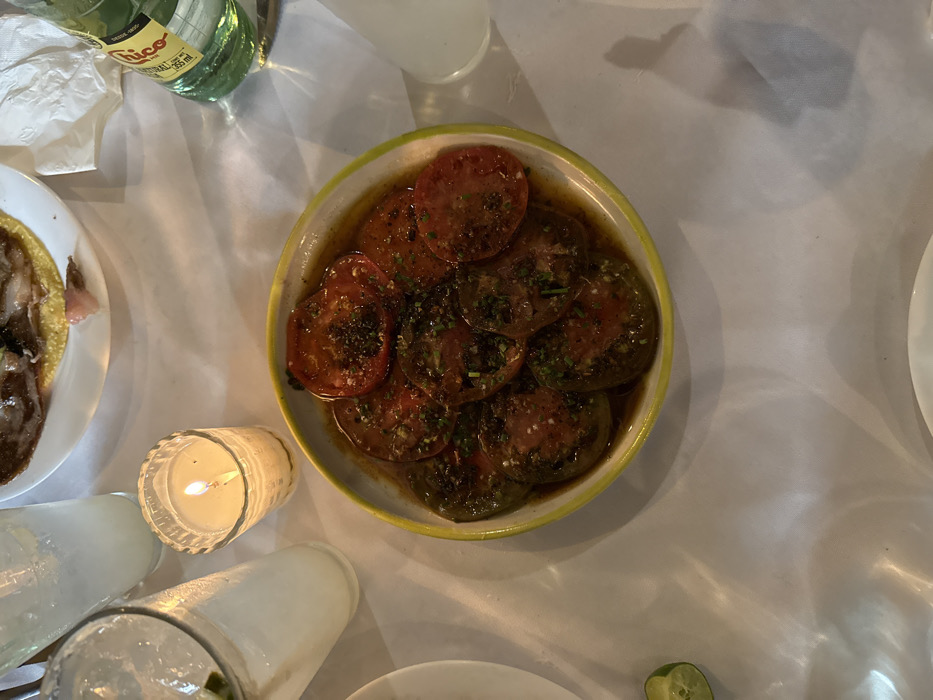 The image displays a dinner table setting at a restaurant in Guadalajara, Mexico, seen from an overhead perspective under low light conditions