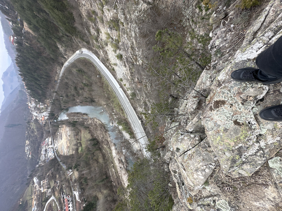 An elevated forensic view captures a mountainous valley encompassing a segment of Srednogortsi, Bulgaria, under an overcast sky. In the immediate foreground, a person's black athletic shoes and lower pant legs are visible, positioned on a lichen-covered rock outcrop at the edge of a cliff. Sparse, small evergreen trees and dry vegetation grow from the rocky terrain directly below the vantage point. Below, a winding two-lane asphalt road, appearing wet or reflective, traverses the valley floor, paralleling a grey-blue river. A white semi-truck is observed driving on the road, heading away from the observer. The river exhibits exposed rocky banks and makes a significant bend to the left, where an open, cleared area with disturbed ground is visible. Along the river and extending up the steep, wooded mountain slopes, residential and commercial buildings indicative of the city of Srednogortsi are clustered, predominantly on the left side of the valley. The surrounding mountains are densely forested with predominantly bare deciduous trees, interspersed with evergreens. The distant mountain ranges recede into a grey, hazy background. No specific interactions are observed.