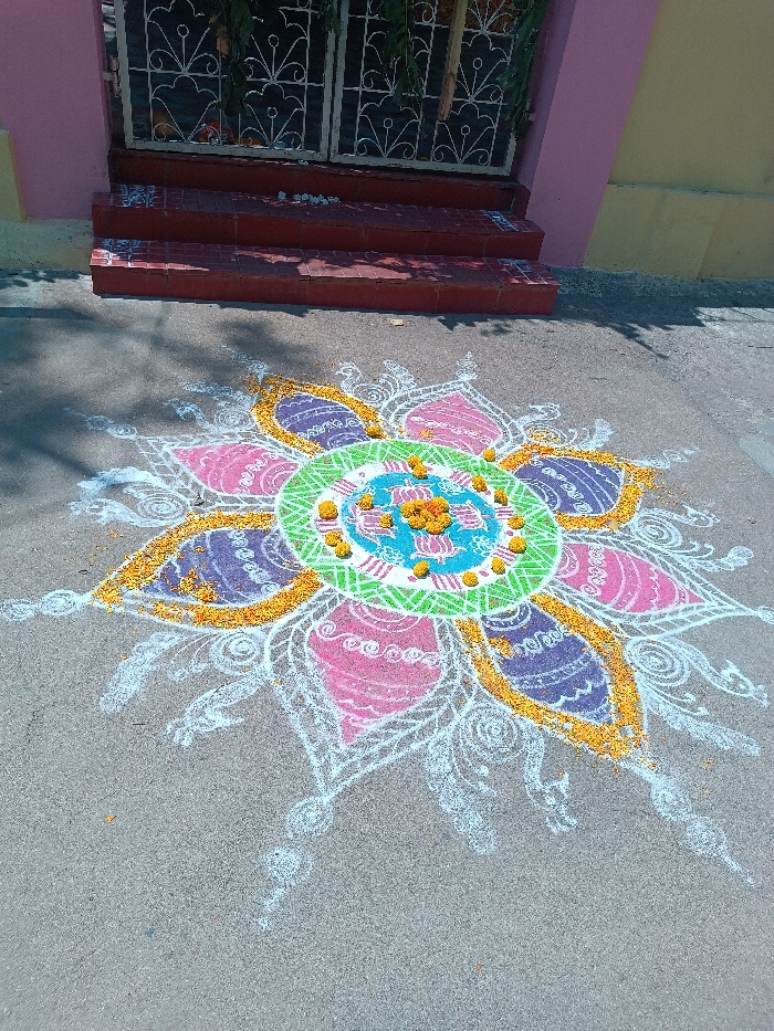 - "The image displays an outdoor scene in Puttaparthi, India, centered on a colorful rangoli (kolam) artwork on a grey concrete surface" by FM-FmCFz2, licensed under CC BY 4.0