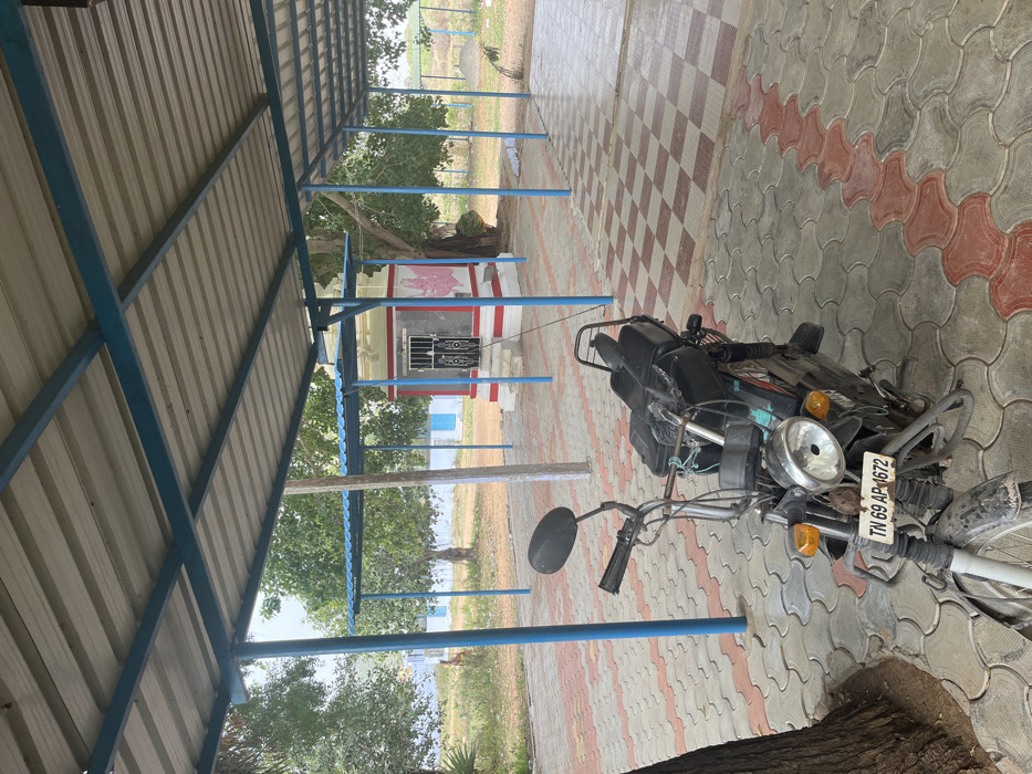 The scene depicts an outdoor paved area under a corrugated metal canopy supported by blue metal poles, located in an unknown city or district in Tamil Nadu, India