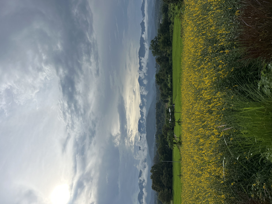 This image depicts a panoramic landscape in Ban Mae Ping, Thailand, under an overcast sky with diffused sunlight. The scene is dominated by agricultural fields and distant mountains. In the foreground, the bottom edge of the frame displays a dense cluster of tall grasses and foliage, exhibiting various shades of green and reddish-brown. Immediately beyond this, a vast field of vibrant yellow-flowering plants, likely Crotalaria juncea, extends across the entire width of the midground, filling approximately one-third of the image vertically. The plants are uniform in height and bloom. Behind the yellow field, a large, flat expanse of bright green agricultural land is visible, characteristic of rice paddies. Within this green field, a single light-colored utility pole stands vertically slightly to the left of center, and a few scattered trees or small structures are faintly discernible in the distance. The background features a long range of undulating mountains, dark green in color, stretching horizontally across the upper mid-section of the image. The peaks of these mountains are partially obscured by low-hanging clouds or mist, which create a soft, ethereal effect. The sky occupies the upper half of the image and is heavily overcast with multiple layers of grey and white clouds. The sun is visible as a bright, diffuse light source in the upper left quadrant, partially breaking through the cloud cover. No individuals, animals, or explicit actions are visible within the frame.