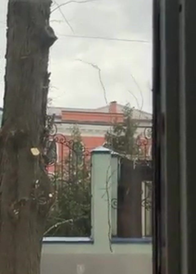 view from inside a building looking out at a tree. The tree has been heavily trimmed. In the background is a fence and a building. A yellow mechanical lift rises next to the tree. Two people are in the lift, apparently working on the tree.