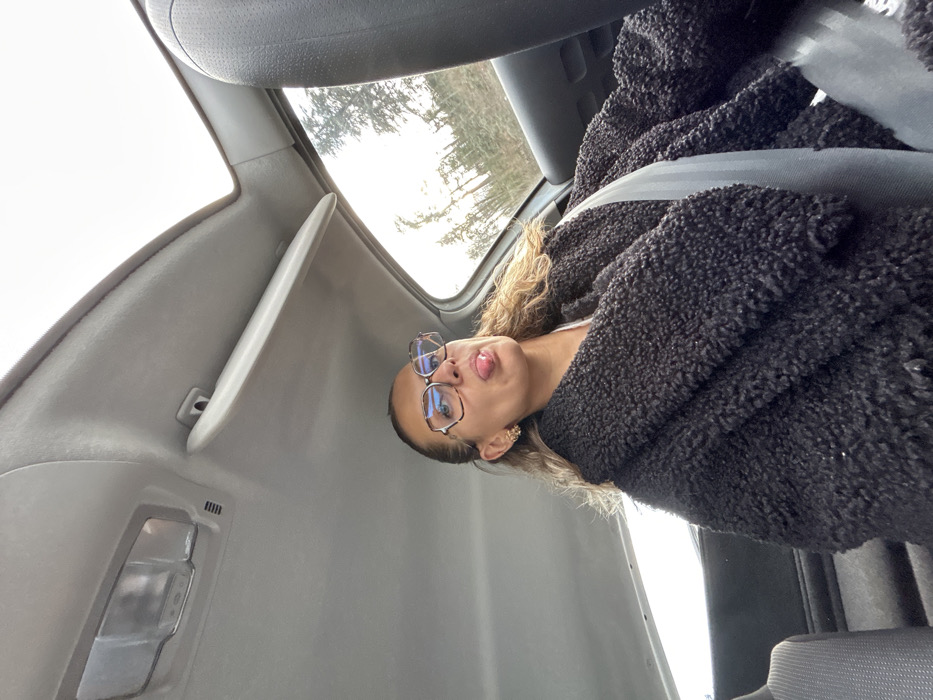 A female individual is seated in the front passenger seat of a vehicle. The scene is contextually located in Villars, France, though no specific geographical landmarks are visible within the image to confirm this. The individual has long, wavy brown hair and wears tortoiseshell-patterned hexagonal eyeglasses, a black textured coat, and a light-colored seatbelt fastened across her chest. A gold-colored earring is visible in her left ear. She is looking towards the camera with her tongue extended in a playful gesture. The vehicle's interior features a light gray headliner, an overhead light fixture, and a raised sun visor on the passenger side. Through the passenger-side window, a daytime outdoor environment is visible, showing bare-branched trees against an overcast sky.