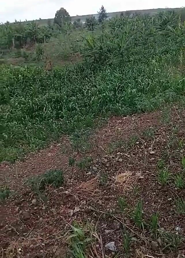 field of crops in a rural area, seemingly in a developing country. The foreground is dominated by dry, brown soil with sparse vegetation. As the camera pans upward, a dense patch of green corn stalks comes into view. Beyond the corn, there are banana trees and other greenery. In the distance, there appears to be a small structure, possibly a house or shed, partially obscured by trees. The sky is overcast.