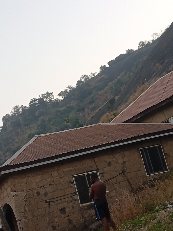 A man with dark hair and shirtless, wearing shorts with a blue stripe, stands near a stone building with a brown corrugated roof. Two windows are visible in the building. Behind the building, a large, rocky mountain covered with trees rises into the sky. The sky appears hazy or overcast. Dry grass and vegetation are near the building. The photo seems to be taken at a tilted angle.