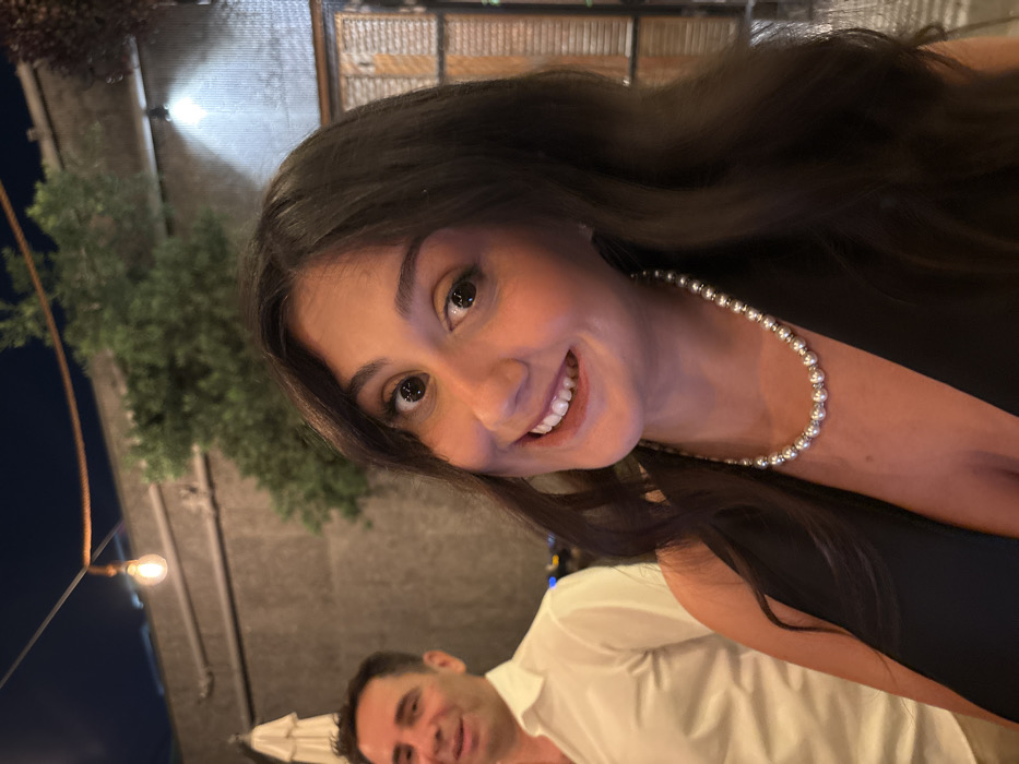 The image presents a close-up of a woman in the foreground, smiling broadly at the camera with her head slightly tilted. She has long, dark, wavy hair and is wearing a black v-neck top accessorized with a necklace of spherical, silver-colored beads. Her eyes are wide open, and she exhibits visible eye makeup and lip gloss. In the blurred background to the left, a man in a white collared shirt is partially visible, turned away from the camera. The setting is an outdoor or semi-outdoor venue, illuminated by artificial light at night, located in Tel Aviv, Israel. Visible background elements include a textured grey wall, green foliage, a partially seen white patio umbrella, and a wooden slat structure. Lighting sources include an exposed filament bulb suspended from a rope and an upward-facing wall-mounted light. The specific location within Tel Aviv cannot be identified from the visual data.