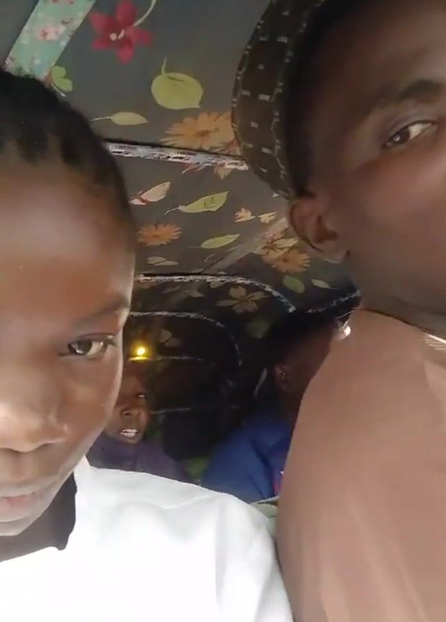 A young woman in a white top with her hair in braids is looking at the camera in a video taken inside a vehicle with a patterned ceiling. She is next to a man who is partially visible. There are other passengers in the background of the vehicle. The woman is smiling slightly. The vehicle appears to be moving, based on the sound in the background.