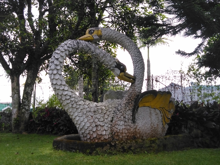 This image depicts a weathered concrete sculpture of two swans with intertwined necks, forming an upright heart shape, situated in Gadog, Indonesia