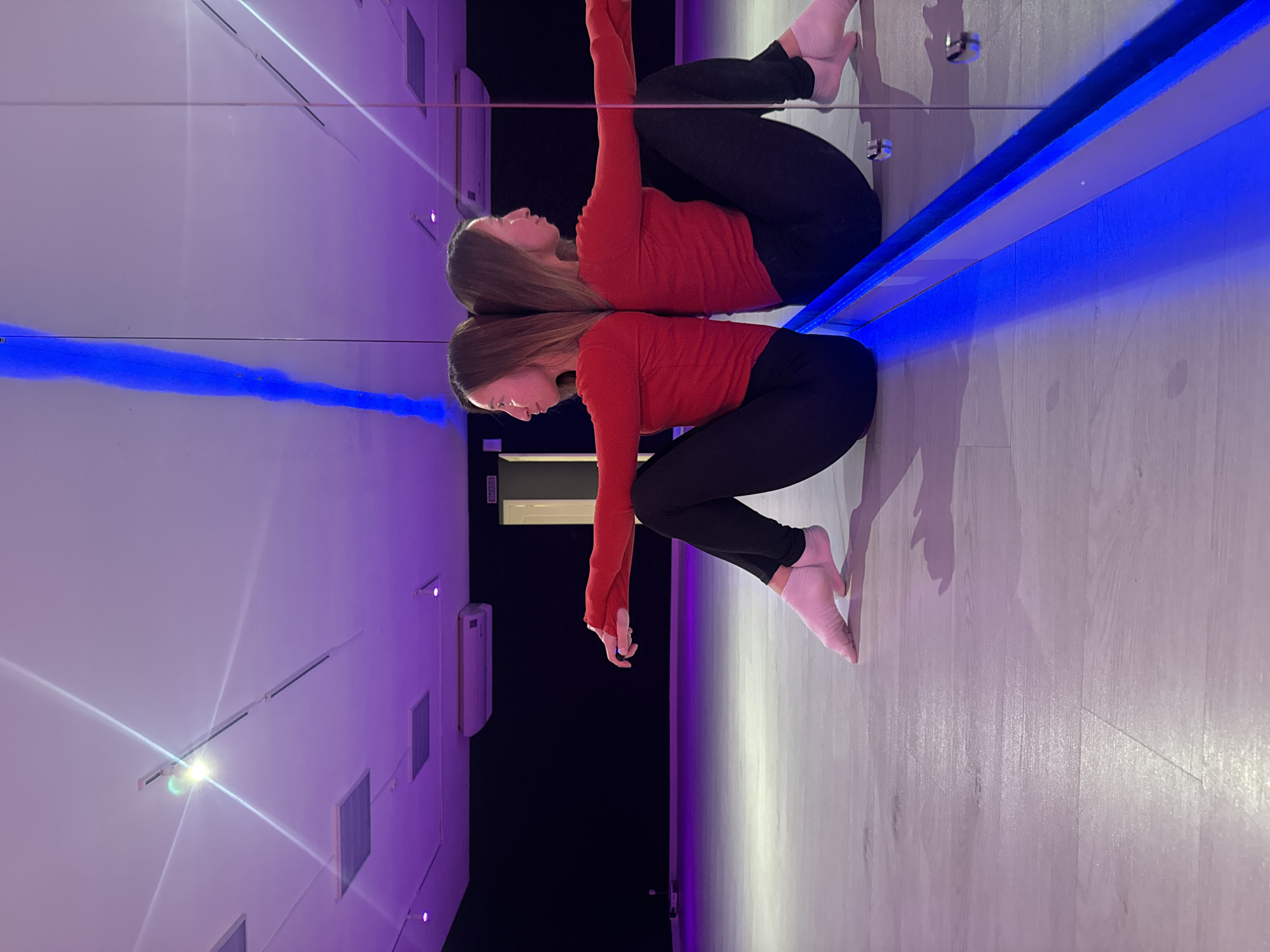 young woman reflected in a mirror in what appears to be a dance studio or gym. She is wearing a long-sleeved red shirt and black leggings. Her body is positioned in a bent or folded pose. Her feet are bare. The environment features a wall with a combination of white and purple hues created by LED lighting. There is a glimpse of what looks like an exit sign and other wall-mounted fixtures. The floor seems to be made of a light-colored wood-like material. The city mentioned (Chaikovsky, Russia) is not discernible from visual clues in the image.