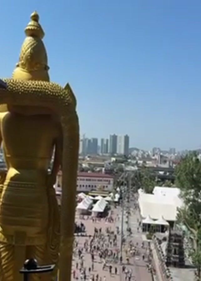 The video provides an elevated view, taken from above, overlooking a crowd of people walking along a path and ascending stairs. A large, golden statue of a deity stands in the foreground, its back to the camera, appearing to guard the scene below. Beyond the crowd and path, a city skyline with several high-rise buildings is visible under a clear, blue sky. Green foliage is present on the right side of the frame, adding a natural element to the urban and religious setting. The overall atmosphere is one of a busy, possibly touristy, location on a bright, sunny day.