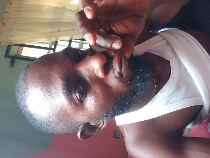 A close-up, angled shot shows a dark-skinned man wearing a white tank top. His hand is near his face, obscuring part of his mouth. He has a short haircut and a trimmed beard with a gold chain visible. The background is blurred, featuring a window with light curtains and a wall with a red and green color scheme.