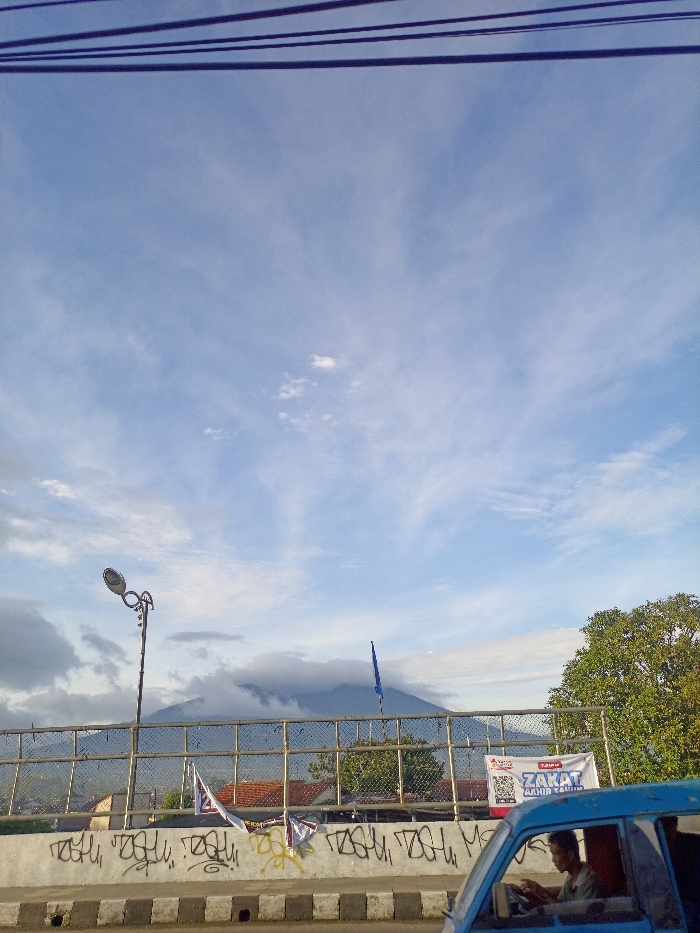 A blue sky streaked with wispy clouds forms the backdrop for a street scene. Overhead electrical wires cut across the top. A mountain with a cloudy peak is visible beyond a fence. Graffiti marks the wall beneath the fence where a banner hangs. A blue vehicle with a driver is partially visible on the right. A street lamp stands to the left of the mountain, complementing the urban landscape.