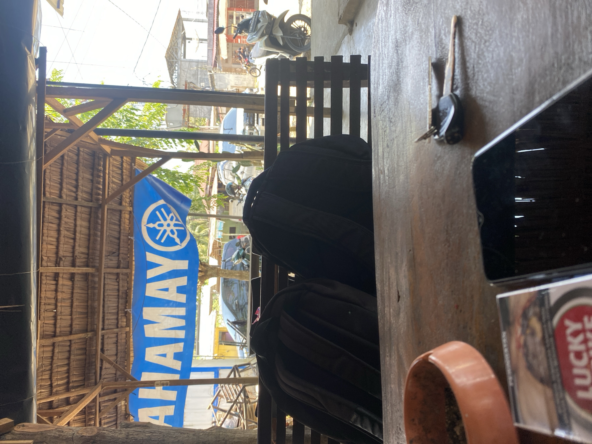 The image presents a static, eye-level view from within a semi-enclosed, open-sided structure, likely a roadside eatery or communal seating area, located in Seuneubok Teungoh, Indonesia. The scene is illuminated by strong natural daylight. In the foreground, a dark, worn wooden table surface displays several items: an orange, shallow, circular ashtray containing ash and cigarette butts is positioned on the left. To its right, a partially visible pack of "LUCKY STRIKE" cigarettes, a black smartphone with a dark, reflective screen, and a set of keys including a black key fob and a metallic key are arranged. Immediately behind the table, two dark-colored backpacks rest side-by-side on a slatted wooden bench. Above the seating area, a thatched roof structure is supported by dark wooden beams and posts. A blue banner, displaying the partial text "AHAMAY" in white capital letters alongside the white Yamaha logo (three tuning forks in a circle), hangs centrally from the roof structure. Beyond this structure, an outdoor urban environment is visible. A paved road or path accommodates parked vehicles, including a dark SUV/van on the left and a white scooter (Honda Vario type) on the right. Various buildings with concrete walls and corrugated metal roofs line the street, with a partially constructed or dilapidated structure featuring exposed rebar visible in the background right. Trees and foliage are scattered throughout the background, and a water tank on an elevated stand is visible behind some trees. No individuals are depicted within the frame.