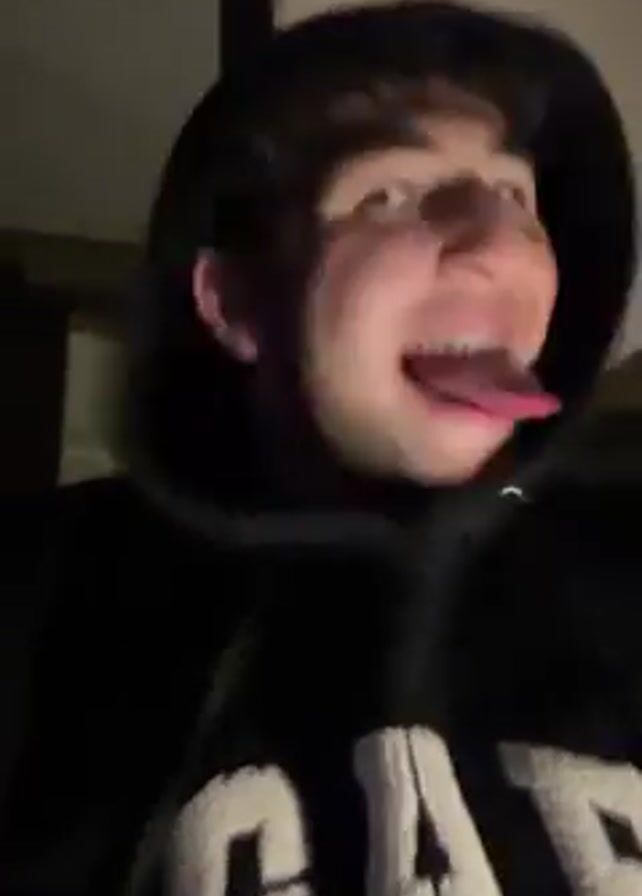 A person with short dark hair, wearing a black hooded sweatshirt with the word "GAP" in white letters on the front, is yelling with their mouth open wide