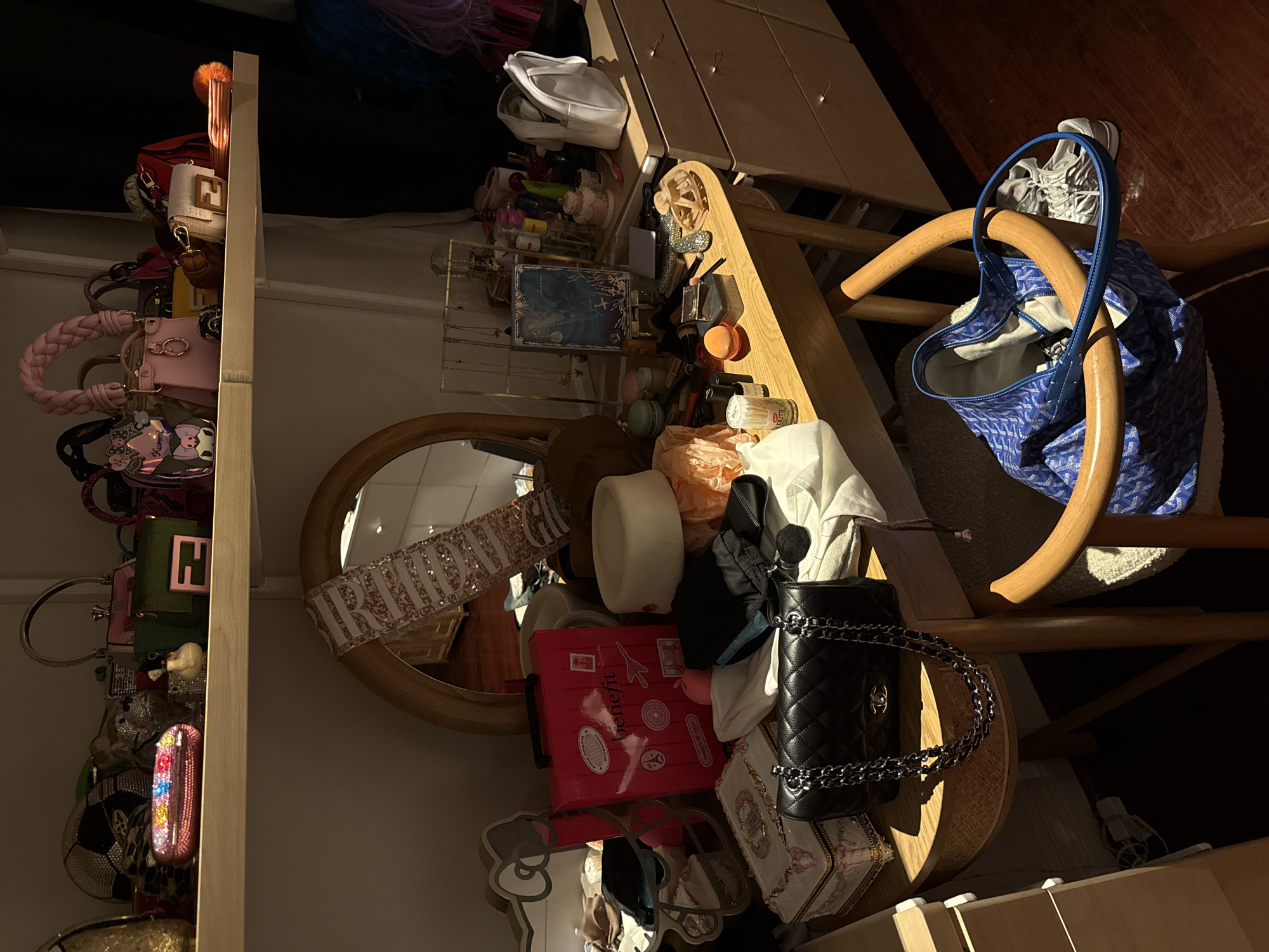 cluttered room with a variety of objects. A shelf on the left displays numerous handbags. A vanity table or dresser is laden with cosmetics, accessories, and a round mirror with a decorative sash. A chair with a blue patterned tote bag and a pair of sneakers is also visible. The room appears dimly lit, with sunlight filtering in. The location in Miami Beach, United States of America, is not evident from the visual information provided.