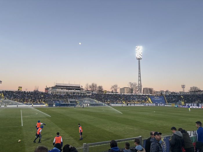 The image captures an evening scene at Georgi Asparuhov Stadium, located in the Poduyane district of Sofia, Bulgaria