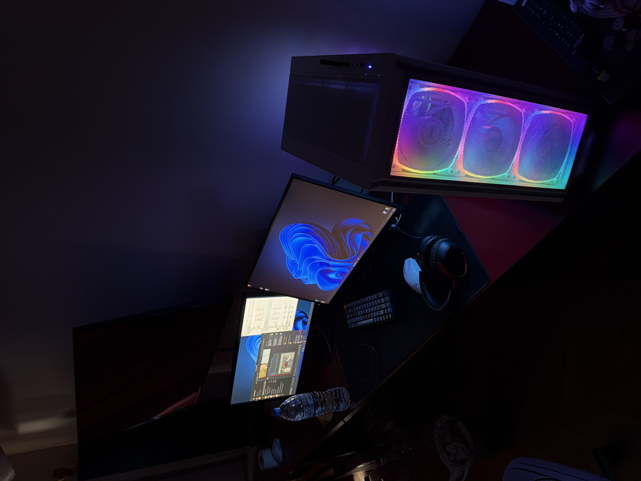 A static indoor scene depicts a personal computer workstation in a dimly lit room in Stara Zagora, Bulgaria. The setup features a dark desk with a large black and red mouse pad. Two active computer monitors are positioned on the desk; the left monitor displays multiple open applications on a Windows 11 desktop, while the right monitor shows the default Windows 11 blue wallpaper. To the right of the monitors, a black computer tower stands vertically, its front panel illuminated by three active RGB fans cycling through various colors. On the mouse pad, a compact mechanical keyboard is centered, with a white optical mouse and a pair of black over-ear headphones with red accents positioned to its right. A full plastic bottle of water rests to the left of the left monitor. A pair of dark-rimmed eyeglasses lies near the keyboard. In the upper left background, a large, dark rectangular screen, possibly an unpowered television or monitor, is visible mounted against a dark blue or purple wall. No individuals are present in the scene.