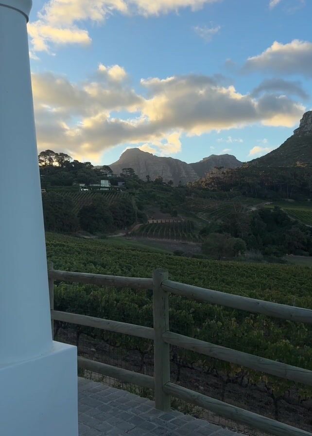 daytime view of a vineyard with hills and mountains in the background. The sky is blue with scattered clouds. A white structure is visible in the left foreground, along with a wooden fence. The vineyard occupies much of the lower frame, with rows of vines stretching across the landscape. Above the vineyard, there's a hillside with trees and a building. In the background, a mountain rises prominently. The camera zooms in slightly to focus on the mountain.