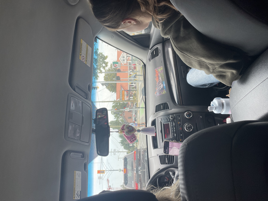 interior of a vehicle from the rear passenger seat, looking forward through the windshield at an urban intersection in Saanich, British Columbia, Canada