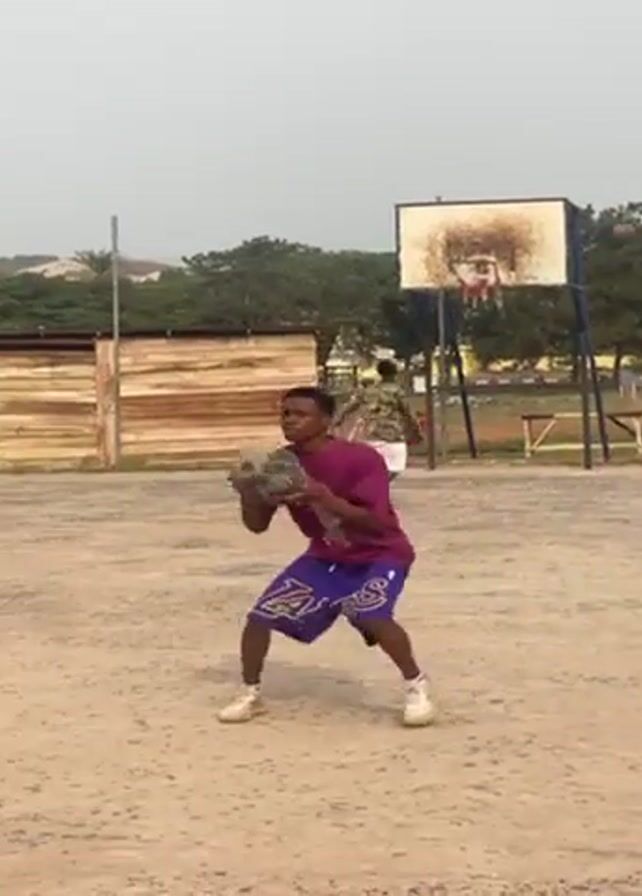 person dribbling a basketball on a dirt court