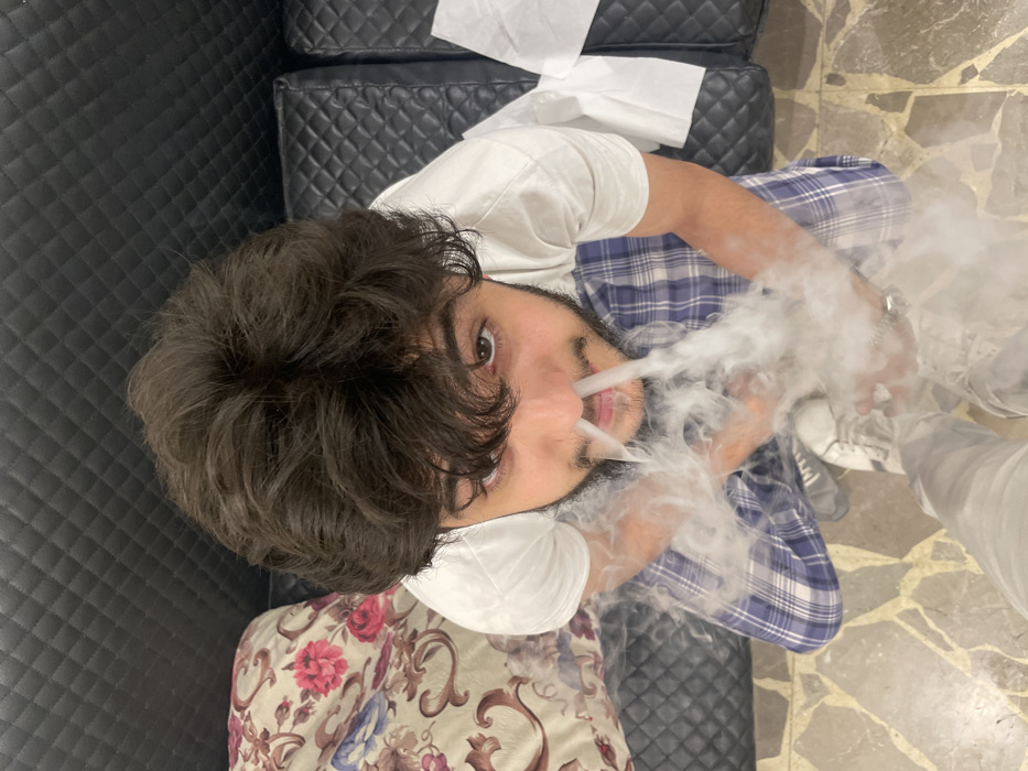 A young male, viewed from a high-angle perspective, is centered in the frame while seated. He possesses dark, wavy hair and light facial stubble, including a mustache and beard. He wears a white short-sleeved t-shirt, blue and white plaid pajama-style pants, and white sneakers. A silver ring is visible on his right ring finger. He is actively exhaling a significant volume of white vapor or smoke, which emerges from both nostrils in distinct streams and also from his mouth, partially obscuring his lower face and hands. His hands are positioned below his chin, holding an unseen object that is the source of the vapor. The background features a dark, possibly black, quilted upholstered surface, consistent with a couch or large chair. To the left, a cream-colored cushion with a floral pattern (red, pink, blue, and brown hues) is partially visible. To the right of the subject, a crumpled piece of white paper or tissue rests on the dark upholstery. The floor beneath the subject is composed of light-colored, irregularly shaped flagstones or tiles with dark grout lines. A leg wearing light-colored pants and white sneakers is partially visible in the bottom foreground, belonging to another individual taking the photo. This scene is situated in Rukn ad-Din Municipality, Syria.