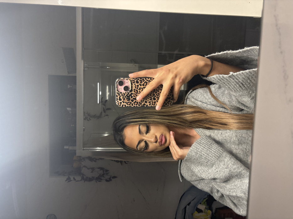 A woman takes a selfie in a bathroom mirror. She holds a phone with a leopard-print case. She has long brown hair, wearing a gray sweater, and resting her chin on her hand. The mirror reflects a bathroom with a shower and some decorations.