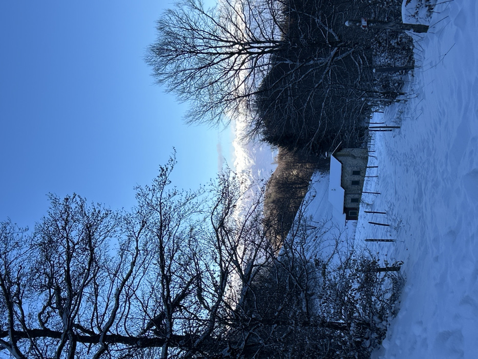 This image depicts a snow-covered winter landscape located in the mountainous terrain near Bellagio, Italy. A narrow, snow-laden path extends from the foreground into the mid-ground, gently curving towards the right. This path is flanked by a rudimentary fence consisting of dark, slender posts connected by wires, partially obscured by accumulated snow. In the mid-ground, to the left of the path, a small, single-story building constructed from light-colored stone stands on a snowy slope. The building features a gabled roof lightly dusted with snow and at least two visible windows on its side. The surrounding environment consists of snow-covered ground and numerous bare deciduous trees, their branches lightly dusted with snow, framing the scene on both sides and populating the slopes. Some darker evergreen foliage is also visible. In the background, a clear, bright blue sky with minimal cloud cover stretches above a prominent range of snow-capped mountains, which appear illuminated by sunlight. The scene is devoid of human presence or active subjects, conveying a serene winter atmosphere under clear, cold conditions.