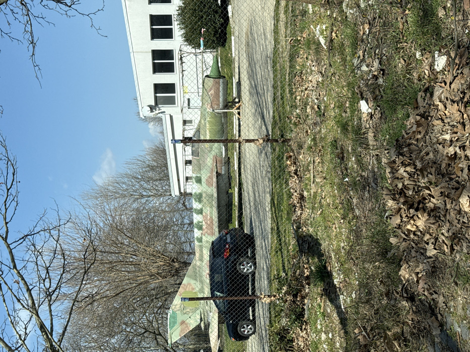 The image captures an outdoor scene in Kazanlak, Bulgaria, featuring a decommissioned military jet. The jet, likely a MiG-19, displays a faded camouflage pattern of green, brown, and tan, and rests on a paved surface. Its vertical stabilizer and rear fuselage are visible on the left, while its forward engine nacelle, supported by a wooden stand, is on the right. A black SUV is parked on the paved surface, positioned between a chain-link fence in the foreground and the jet, partially obscuring the aircraft's mid-section. The chain-link fence, with brown posts, extends horizontally across the lower-mid portion of the frame. The immediate foreground is a patch of ground covered with sparse green and brown grass, numerous dry, fallen leaves, and scattered small white pieces of litter. In the background, behind the jet, stands a modern, two-story white building featuring multiple dark-framed windows. A dark green bush is visible to the right of the building. The upper background shows a clear blue sky with minimal wispy clouds, and a dense cluster of bare deciduous trees line the distant horizon. No individuals or specific actions are depicted.