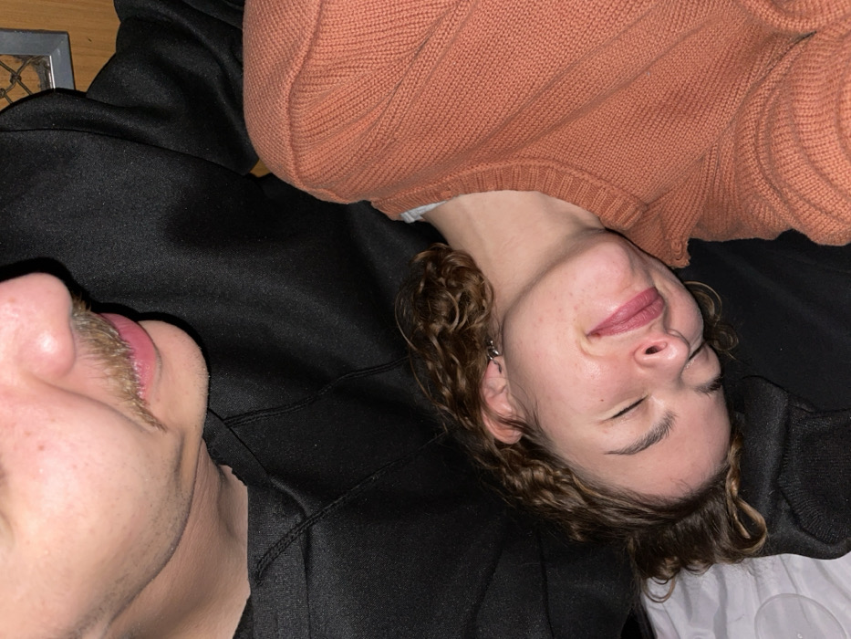 A close-up shot shows two people reclining. On the left, a partial view of a man's face reveals a mustache and closed lips. The person on the right has curly brown hair and is wearing an orange sweater. They are both laying on a black sweatshirt and what appears to be a white sheet. The person on the right has their eyes closed and a slight smile. The overall composition is close and intimate, suggesting a relaxed or affectionate relationship between the two individuals.