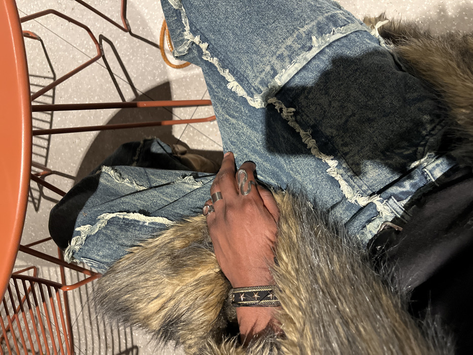 A person sits in an orange metal chair, wearing distressed denim jeans. The denim has fringed edges. The person wears rings on their fingers and a black and silver bracelet. A brown, fur-trimmed jacket or vest is on their lap. The floor is light-colored with shadows from the chair.
