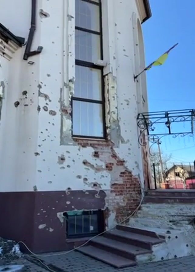 exterior of a white building, apparently a church, with significant damage in the form of many small holes in the walls and exposed brick. A Ukrainian flag is visible on the side of the building. The sky is clear and blue. There are steps leading up to a door or entrance, with a wrought iron railing. Some debris or snow is visible on the ground near the building. The camera pans up, revealing a golden dome at the top of the building.