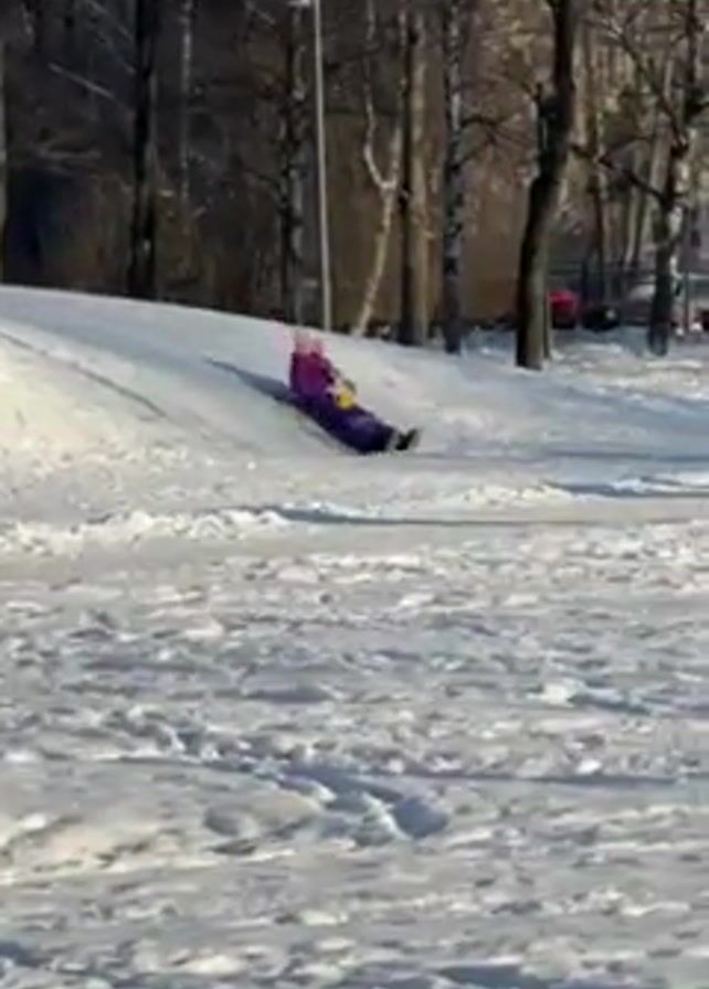 A young child in purple snow gear and a pink hat is sliding down a snow-covered hill on a yellow sled. The child starts on their stomach, then rolls over onto their back as they slide down the hill. The background shows a snow-covered park with bare trees, and buildings can be seen in the distance. The sun is shining, creating a bright, wintry scene. Another sled, green in color, is visible on the ground near the child.