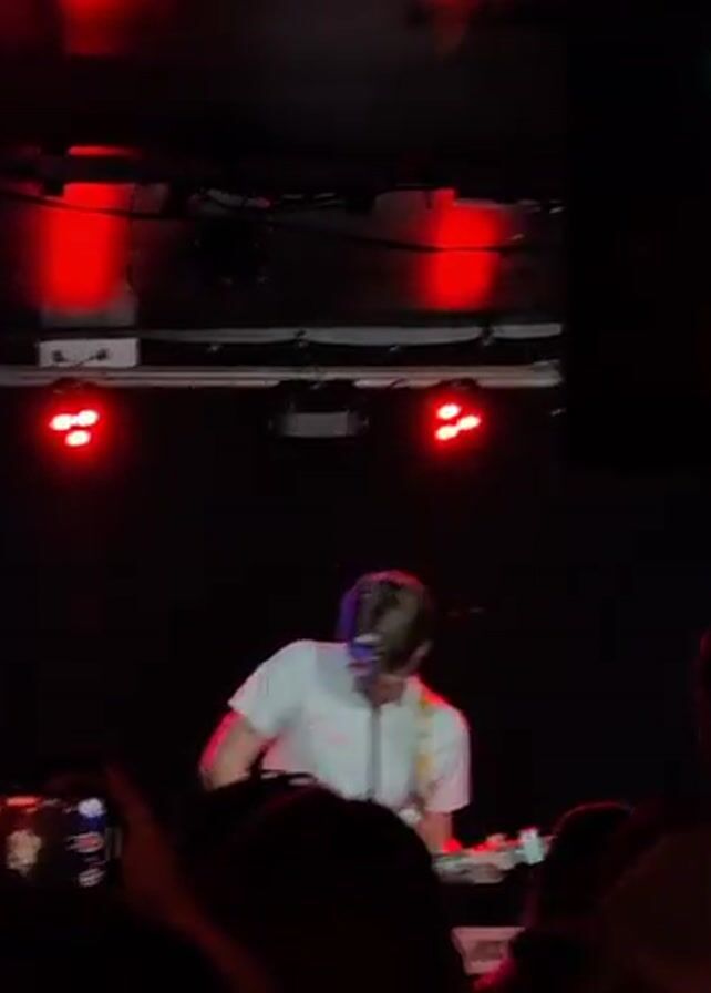 A young man with glasses is playing an electric guitar and singing into a microphone on a stage. He is wearing a white t-shirt. There are red and blue stage lights above him and a speaker cabinet to the right. An audience is visible in the foreground. The room appears dark and the stage is dimly lit.
