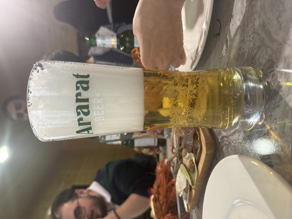 The image captures an indoor dining scene in Voskevaz, Armenia. In the foreground, a tall glass of "Ararat BEER" is prominently displayed, filled with a light amber liquid, a substantial white foam head, and numerous visible bubbles. The glass rests on a dark grey, speckled tabletop. To the left of the glass, a partial white plate is visible. In the midground, a wooden serving board holds several bivalve shells, some containing prepared seafood, with a lime slice positioned on one shell. Adjacent to the board on the left, a large quantity of cooked red crayfish or small lobsters is arranged on a metal tray. On the right, a human hand is holding a piece of red seafood. Multiple green glass bottles are partially visible on the table surface. The background, blurred, shows several individuals gathered around the table. A male with a beard and glasses, wearing a dark green and white striped shirt, is visible on the left. Other indistinct figures are present, suggesting a social gathering. The room features wooden wall paneling and overhead lighting fixtures.
