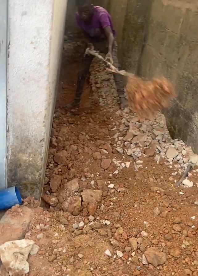 A man in a purple shirt and patterned pants is digging in a narrow trench. The trench is between a concrete wall on the left and a cinder block wall on the right. The ground is mostly red dirt with large rocks and pieces of broken concrete scattered throughout. The man is using a shovel to move the dirt and rocks. A blue pipe is visible near the bottom left corner of the frame. The camera is static, providing a medium shot of the scene. The area is exposed to sunlight from above.