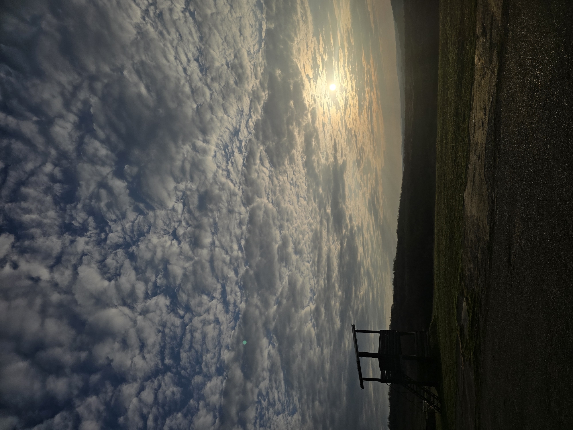 The image captures an outdoor landscape in Beliakovets, Bulgaria, during either sunrise or sunset. The sky, occupying the upper two-thirds of the frame, is covered extensively with textured altocumulus clouds, exhibiting varied shades of gray and white, with small patches of blue visible between them. The sun is visible towards the right, low on the horizon, casting a bright, golden-orange glow that diffuses through the clouds, creating faint rays of light. In the midground, to the left, a dark, wooden, two-tiered observation tower or hunting blind stands silhouetted. It features an open top platform and a partially enclosed lower section, with an external ladder or staircase visible on its left side. The ground beneath the tower and extending to the right is a grassy field. The background consists of a dark, undulating line of forested hills or mountains, silhouetted against the horizon. The immediate foreground is a dark, granular surface, appearing to be an unpaved road or dirt path. No individuals, animals, or specific activities are present within the scene.