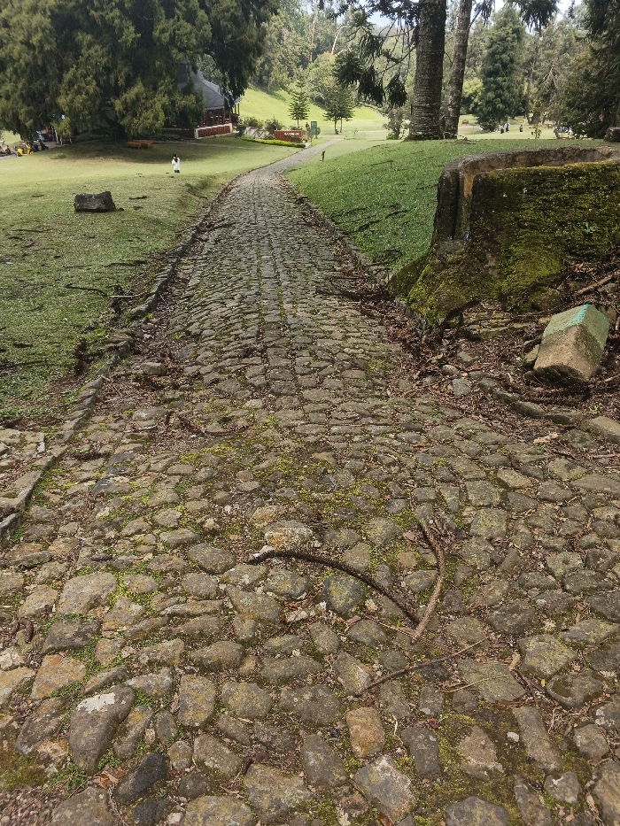 An outdoor scene in Tapaiteng Uesa, Bhutan, depicts a cobblestone path winding uphill and curving to the left, receding into the distance