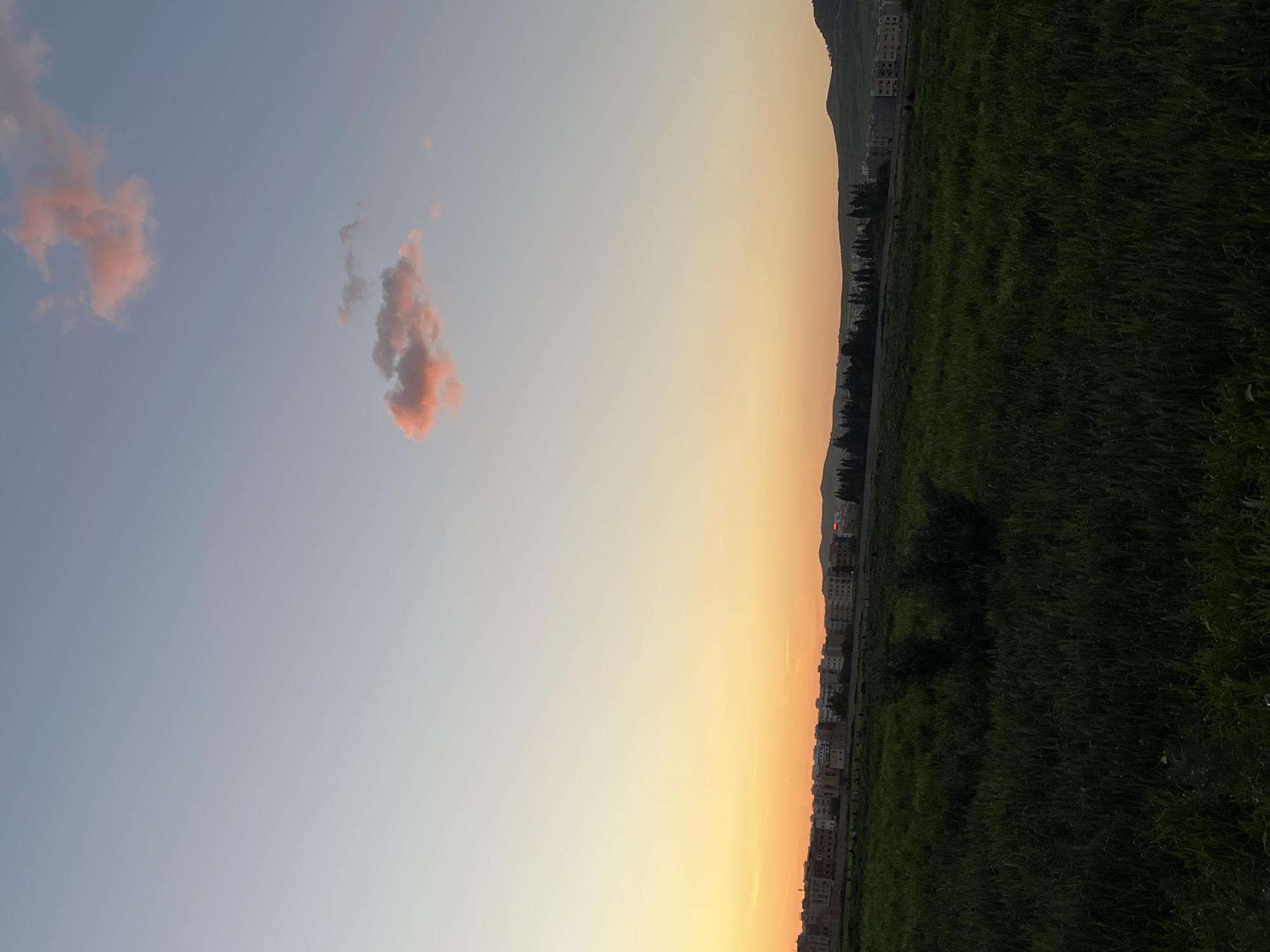 landscape at sunset. In the sky, two pink clouds are visible against a gradient of light blue to orange. The ground is covered in green grass, with trees delineating a line between the grass and a city skyline with buildings and a mountain in the background. The location appears to be Fez, Morocco, based on the buildings and mountainous landscape in the background. No people are visible.