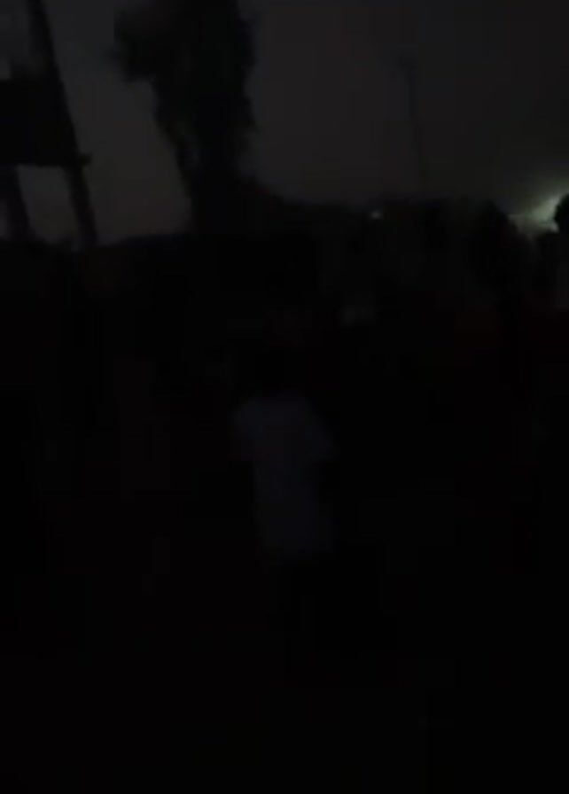 dimly lit outdoor scene with a crowd of people. It appears to be nighttime, and the lighting is poor. It's difficult to make out specific details about the people or the objects around them due to the darkness, but it appears there may be a structure of some kind on the left side of the frame. The crowd seems to be somewhat active, although their specific actions are not clear.