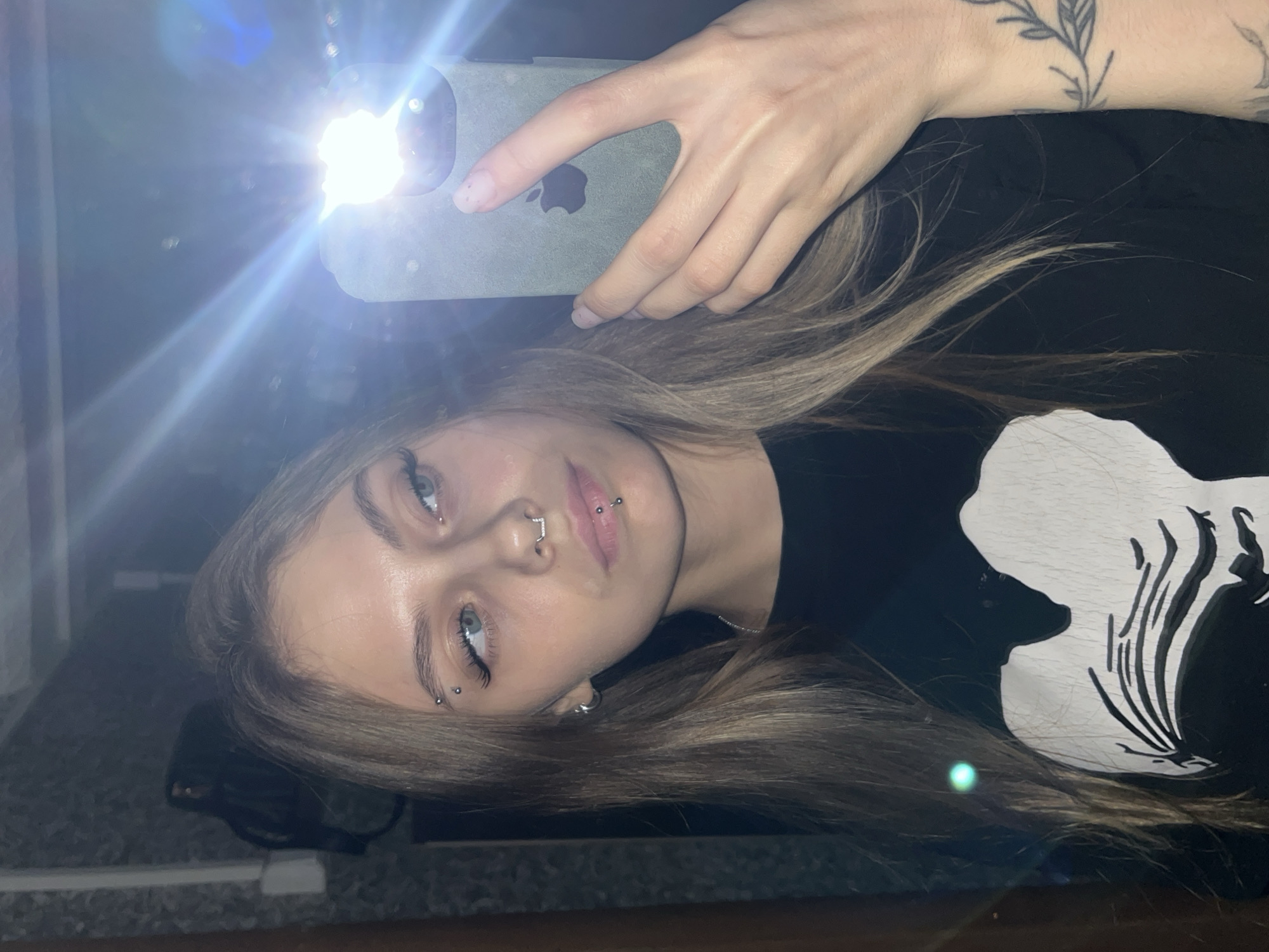 A young woman with long, light brown hair is taking a selfie in a mirror, holding an iPhone in her right hand. The flash is activated, causing a bright glare. She has multiple facial piercings including an eyebrow piercing, nose ring, and lip piercings. She's wearing a black t-shirt with a white graphic design. There is a tattoo on her left forearm. The background appears to be a room with a carpeted floor. It is not possible to determine the exact location of the city of Фоки, Russia.