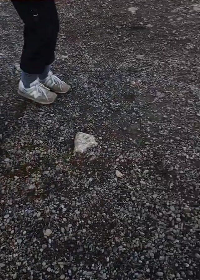 dog park on a sunny day. The ground is covered in small gravel. Initially, a Rottweiler walks toward the right of the frame, then it cuts to a small, white and brown dog sitting in the middle of the gravel. The Rottweiler approaches the small dog, and they interact briefly. The backdrop includes a fence, some sparse greenery, benches, and a view of the water and mountains in the distance. Two bare trees are visible on either side of the water view. Other people are visible in the background.