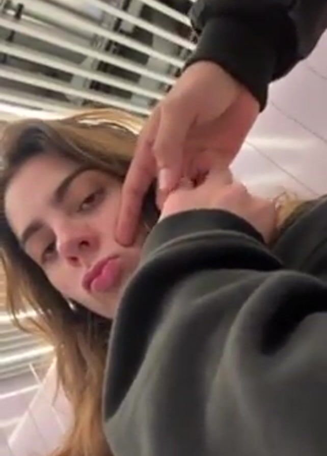 A person in a dark jacket holds the face of a woman with long brown hair, who is wearing a dark-colored hoodie. The woman pokes her tongue out and then closes her eyes. The scene appears to be indoors, with a slatted ceiling visible in the background.