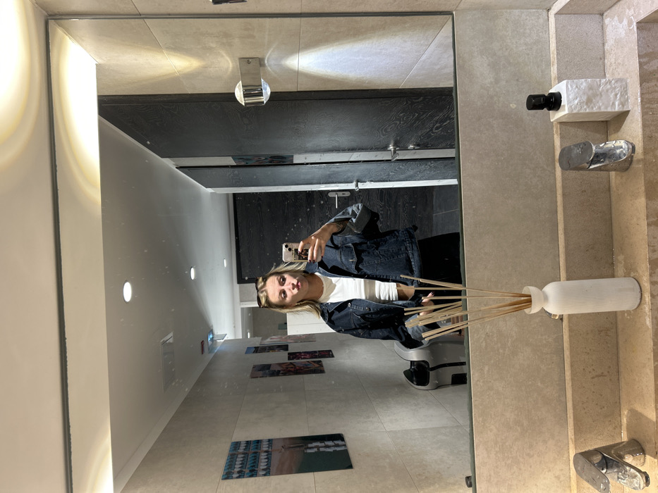 The image displays a mirror selfie taken by a sole female subject in a modern restroom, likely located within a public or commercial establishment in Cannes, France. The exact location within the city is not discernible. The subject, a female with blonde hair, fair complexion, and sunglasses perched on her head, is reflected from the waist up. She wears a white crop top, an oversized dark blue denim jacket with rolled sleeves, and dark pants. Her mouth is slightly pursed. She holds a dark-colored smartphone in her right hand at arm's length, angled towards her reflection to capture the image. The restroom features light-colored, possibly beige or grey, rectangular wall tiles. A light-colored stone countertop with integrated sinks is visible in the foreground. On the countertop, from left to right, are a silver-toned single-lever faucet, a white ridged cylindrical vase containing light brown diffuser reeds, and a square white marble or stone soap dispenser with a black pump. A second silver-toned faucet is partially visible on the far right. Reflected in the mirror, the background reveals additional details: three framed artworks adorn the left tiled wall, depicting abstract or graphic designs. A grey and black wall-mounted unit, possibly a hand dryer or waste bin, is partially visible to the subject's left. Two dark, textured doors with silver handles are present further back in the reflected space. The ceiling contains recessed circular lighting fixtures. A modern wall sconce with a chrome base and a clear dome is mounted on the tiled wall to the right, casting light patterns. The large rectangular mirror itself features integrated backlighting along its top edge.