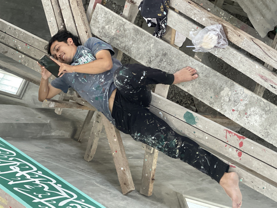 A male individual is depicted lying supine on a makeshift wooden scaffolding structure within an unfinished room in Kumbang, Indonesia. He wears a paint-splattered grey t-shirt and black pants, and is barefoot. The individual holds a dark-colored smartphone horizontally with both hands, appearing to operate its camera, and exhibits a slight smile. The wooden scaffolding is heavily marked with various paint splatters, including red, green, and white. In the background, a bare concrete wall features a horizontal band of teal paint with white Arabic calligraphy. A window with white framing is visible in the upper right. Near the individual's feet on the scaffolding, a translucent plastic bag containing contents and a folded dark cloth are present. The ground beneath the scaffolding appears to be dirt or gravel.