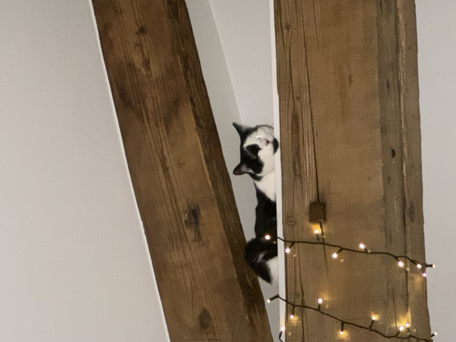 A black and white domestic cat is observed resting horizontally on a flat, light-colored surface, positioned atop a substantial dark brown wooden beam with visible grain and knots. The cat's head is slightly lowered, and its eyes exhibit a distinct light reflection. Its black tail is partially visible on the left. Another parallel dark brown wooden beam is positioned above the cat, closer to the upper frame. A string of small, warm-toned decorative lights is draped along the lower wooden beam, extending into the bottom-left quadrant. The background consists of plain white walls or ceiling surfaces. The scene is located within a building in Puteaux, France.