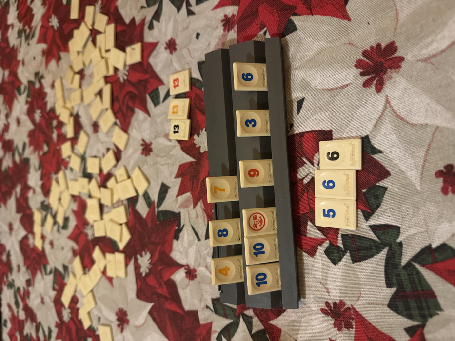 A Rummikub game is in progress. Several tiles are scattered on a tablecloth with a poinsettia pattern. A dark gray tile holder displays the following numbers: 4, 10, 10, 8, a joker, 7, 9, 3, and 6. Three number 13 tiles sit next to the holder. To the right are tiles showing a set of 5, 6, and two 6s. The scattered tiles are likely the remaining pieces from which players draw.
