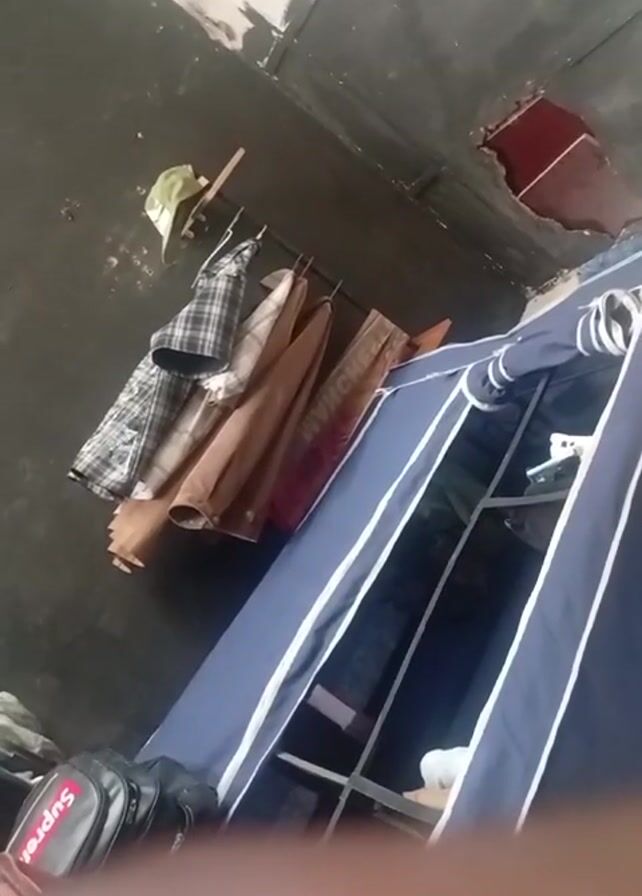 The camera pans across a dimly lit room. On the left, a wall is visible with clothes hanging on a rack. A hat rests on top of the rack. The clothes include a plaid shirt, a beige jacket, and another piece of clothing partially obscured. A blue wardrobe stands to the right, its contents mostly hidden. The room has a worn, unfinished appearance. At the bottom left of the frame, part of a black bag with the word "Supreme" in red is visible. A hand briefly enters the frame at the very beginning. The camera slowly moves from left to right, eventually focusing on the clothes hanging on the rack.