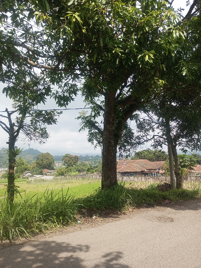 The image depicts a rural or semi-urban Vietnamese landscape under a partially cloudy sky, on the outskirts of an unspecified city. In the foreground, a dark asphalt road surface occupies the lower right and bottom, exhibiting areas of direct sunlight and shadow from overhead trees. The road's edge is lined with abundant green grass and weeds, with minor debris visible. A large, mature tree with dense green foliage and a textured trunk stands prominently on the right. To its left, a thinner tree with sparser leaves hosts an epiphytic plant growing on its trunk. Between these trees, a vibrant green cultivated field, consistent with rice paddies, stretches horizontally towards the midground. Beyond the field, a low wall or fence line is discernable, separating it from a cluster of residential structures. Multiple houses with traditional orange or dark red tiled roofs are visible, interspersed with dense green vegetation. The background reveals a series of rolling hills or mountains under a predominantly overcast sky with scattered brighter cloud patches. No individuals, animals, or vehicles are present in the scene.