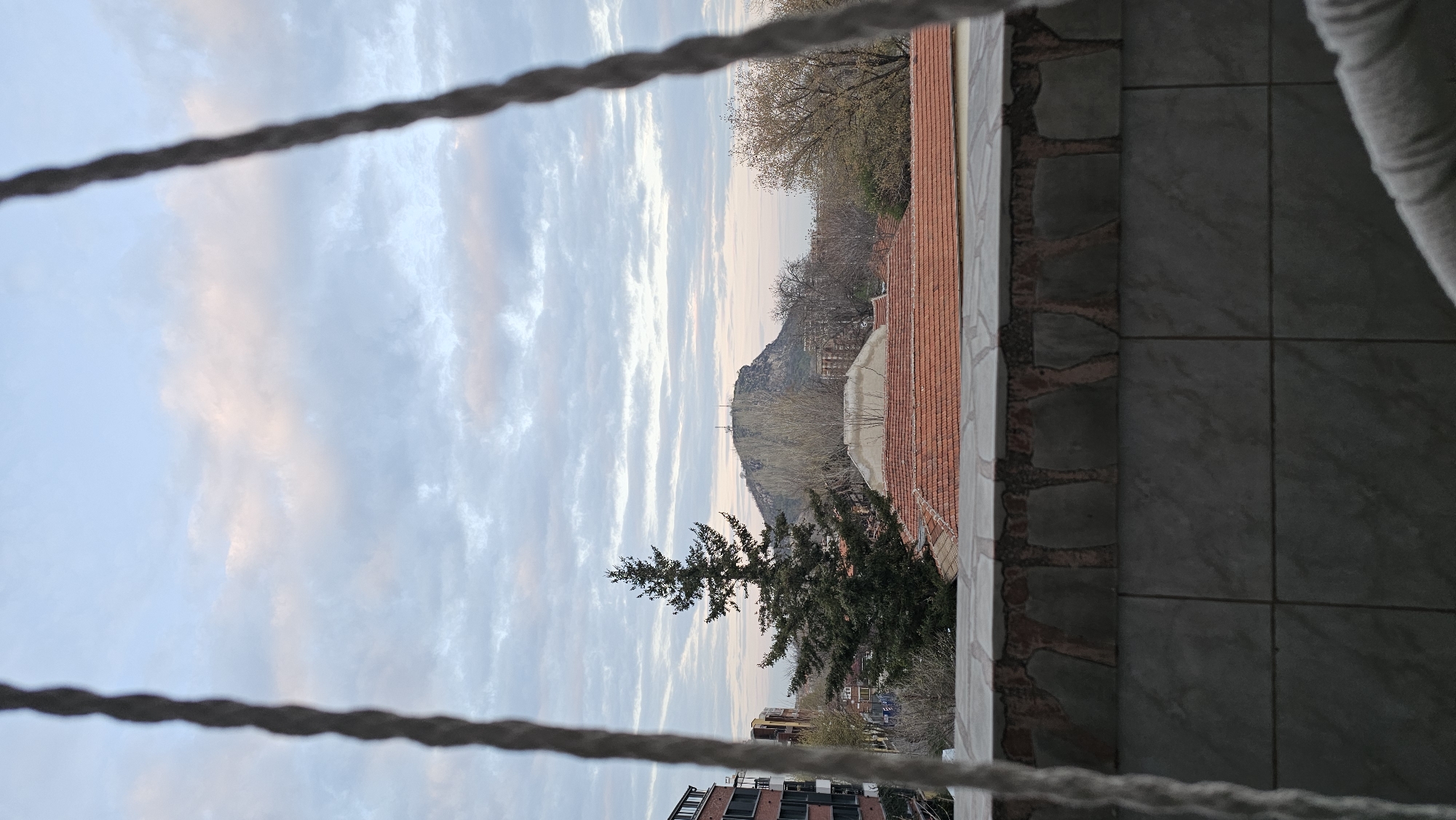 The image presents a panoramic view of a Plovdiv cityscape, observed from what appears to be an elevated position, possibly a balcony. The scene is framed vertically by two out-of-focus, braided ropes, one on the far left and one on the far right. In the immediate foreground, a tiled railing or balustrade is visible, featuring a top course of irregular, light-colored stone or tile fragments set in mortar, above a lower section composed of large, rectangular, grey ceramic tiles. Beyond the railing, the midground reveals a dense urban environment. Numerous rooftops, predominantly featuring traditional red terracotta tiles, are spread across the scene. A tall, dark green coniferous tree stands prominently to the left of center, partially obscuring buildings behind it. To its right and further afield, several deciduous trees, largely bare, indicate either late autumn, winter, or early spring. Parts of modern multi-story buildings with dark facades and numerous windows are visible on the far left. In the background, dominating the horizon, is a distinct hill identified as Sahat Tepe (Danov Hill) in Plovdiv, Bulgaria. Its peak is characterized by multiple communication towers and antennas. The sky above is a pale blue, adorned with scattered white and light pink-tinged stratocumulus clouds, suggesting either dawn or dusk. No individuals are visible in the scene.