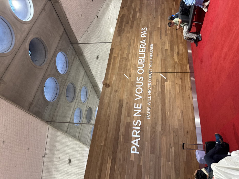The image captures an indoor terminal area within Paris Charles de Gaulle Airport in Le Mesnil-Amelot, France